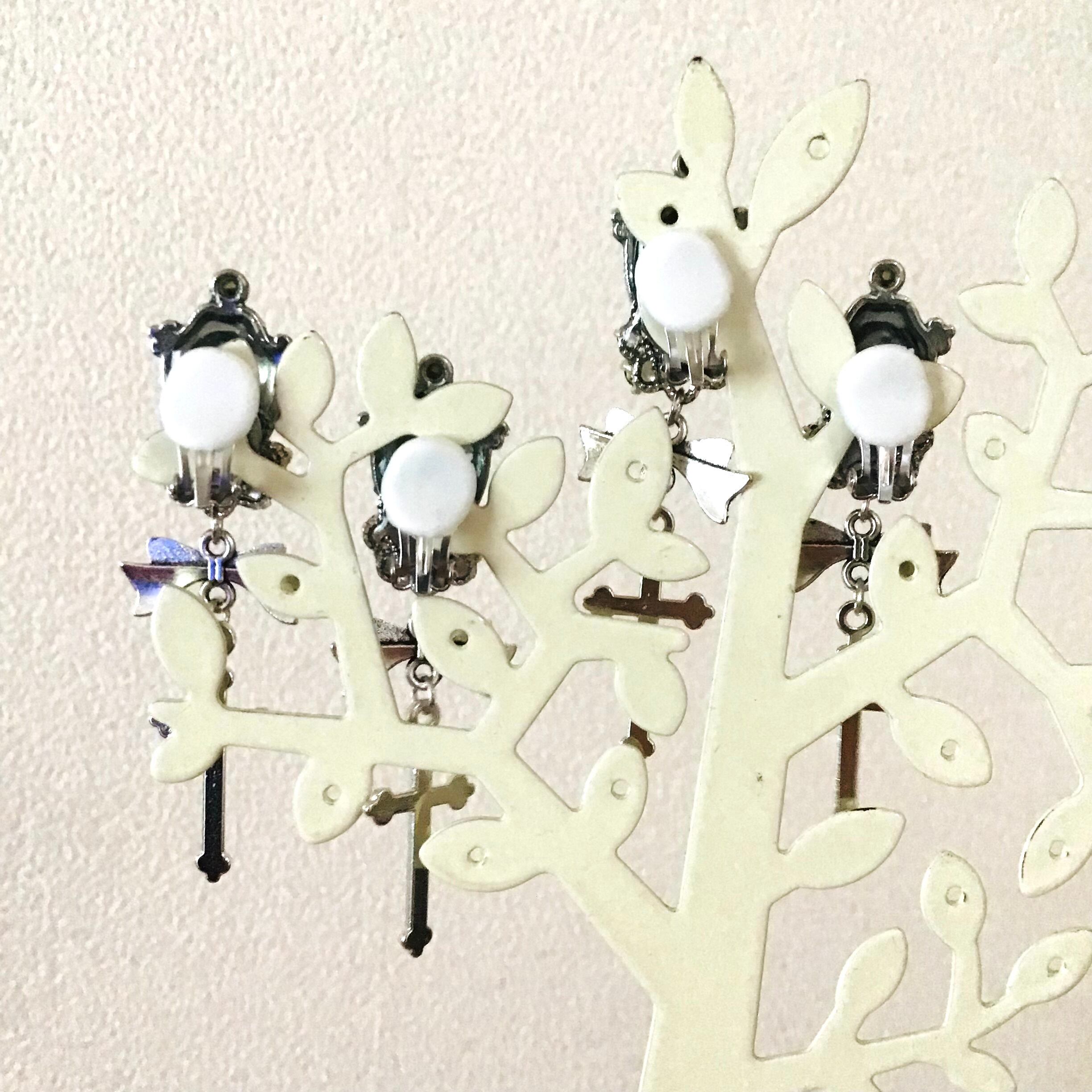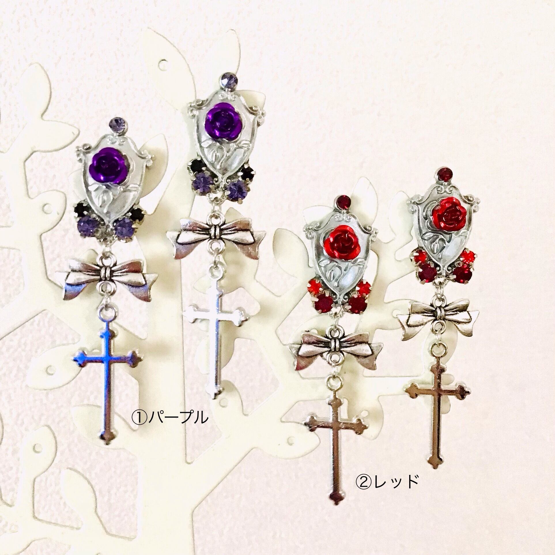 アルミ薔薇を貼り付けた薔薇の紋章と十字架パーツを組み合わせ、ガラスビジューで飾ったゴシックテイストなイヤリングです。