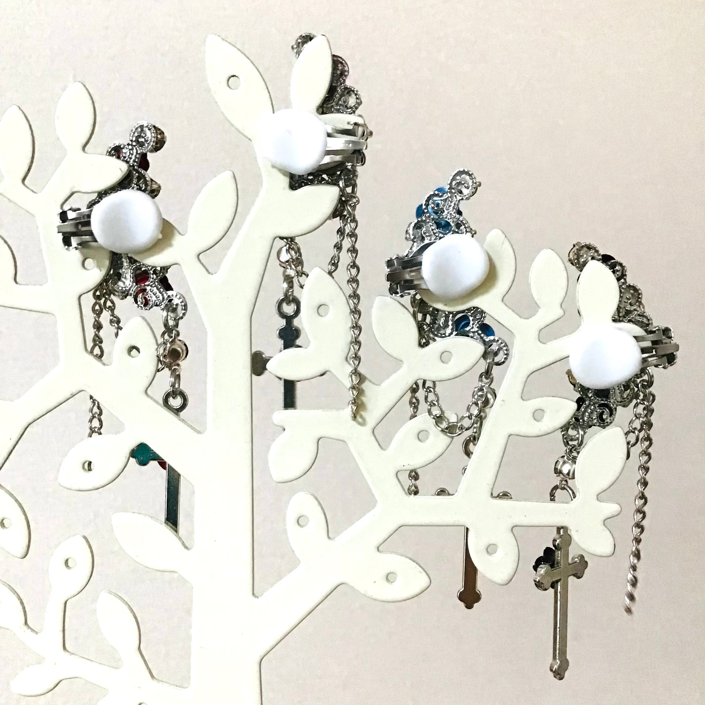 ガラスのビジュー×アルミ薔薇をつけた十字架をチェーンで繋いだをゴシックテイストなイヤーカフです。