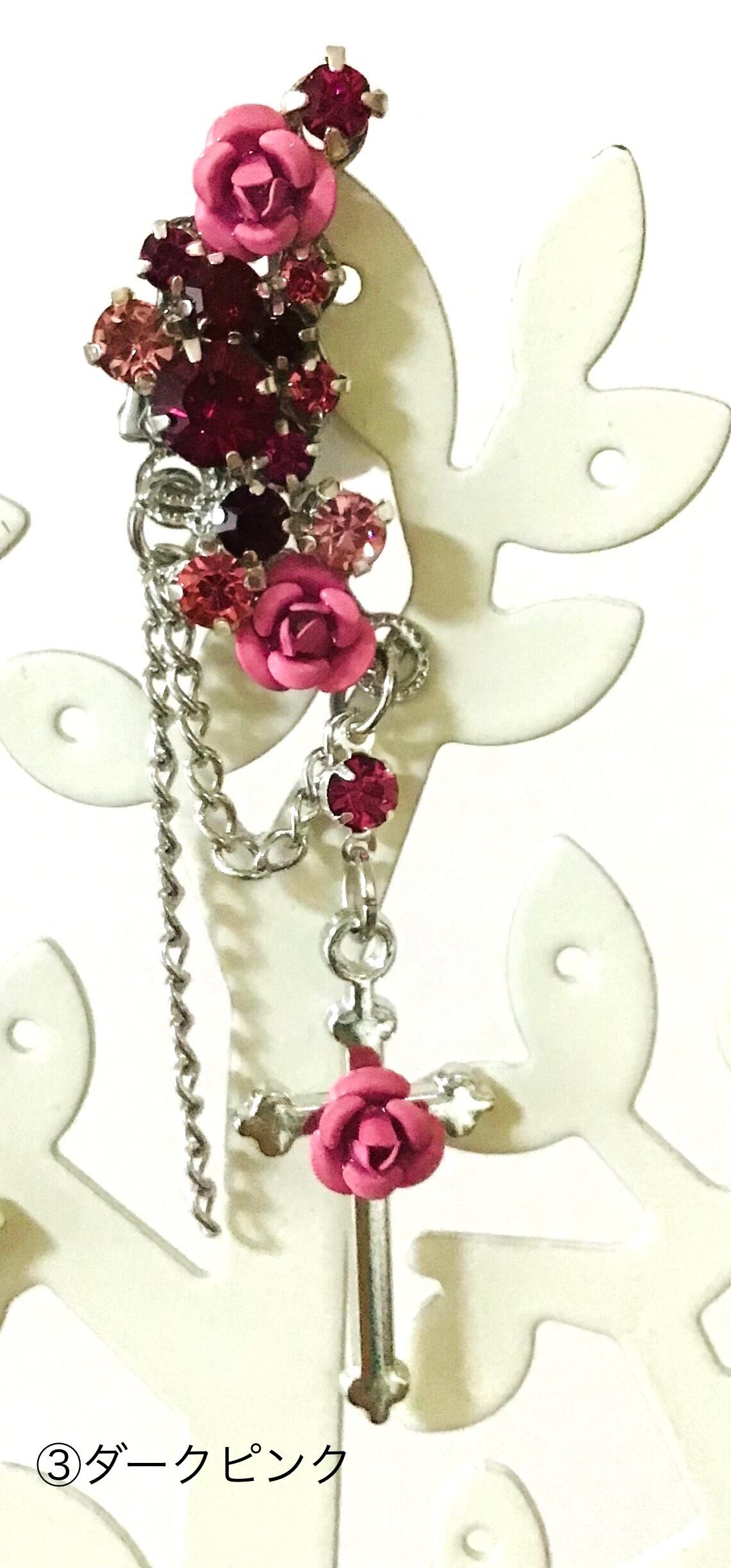 ガラスのビジュー×アルミ薔薇をつけた十字架をチェーンで繋いだをゴシックテイストなイヤーカフです。