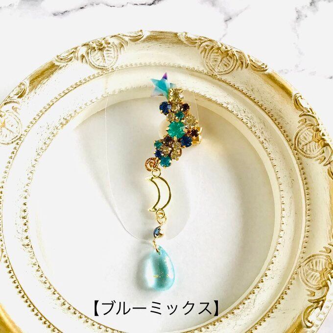 キラキラ輝くガラスのビジューと星のモチーフ、月のモチーフを組み合わせ、ガラスのしずくチャームを下げた夜の色が零れ落ちるようなデザインのイヤーカフです。
