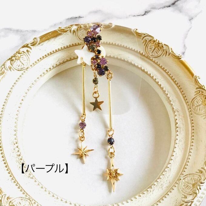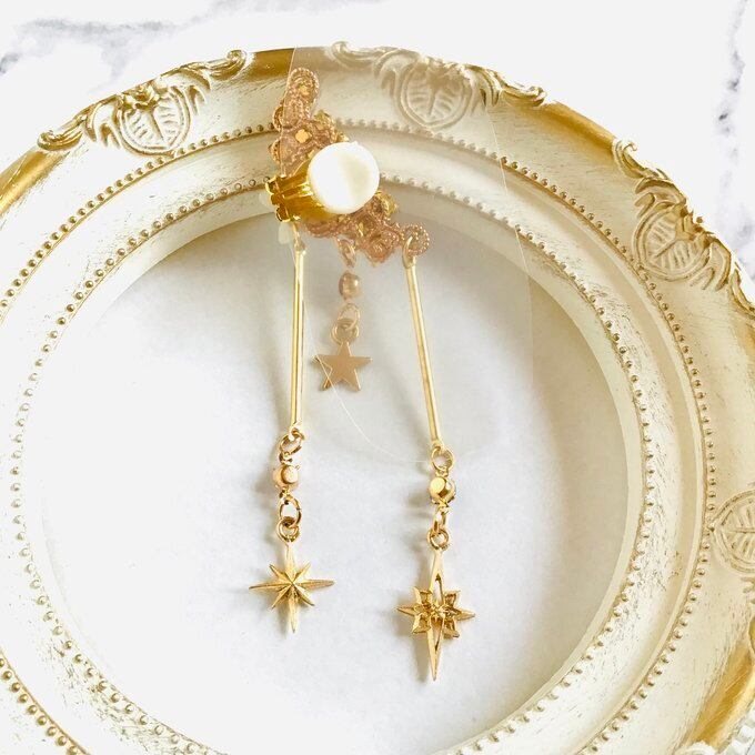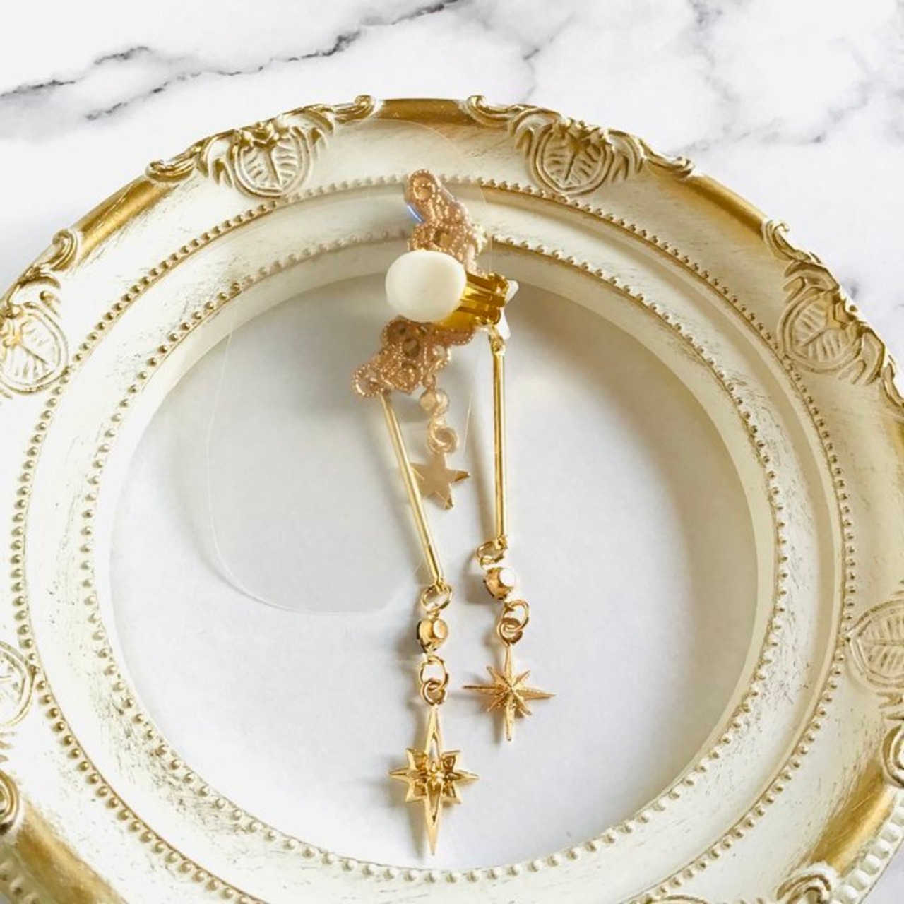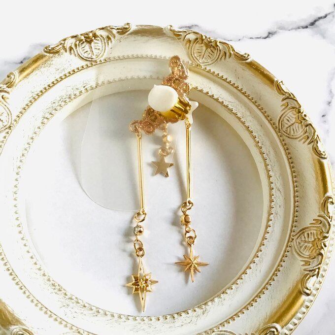 マットホワイトのお星様、小粒ゴールドのお星様、キラ星とたくさんの星が詰まったイヤーカフです。