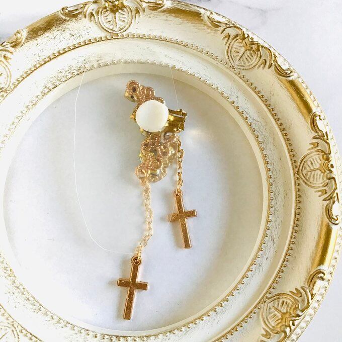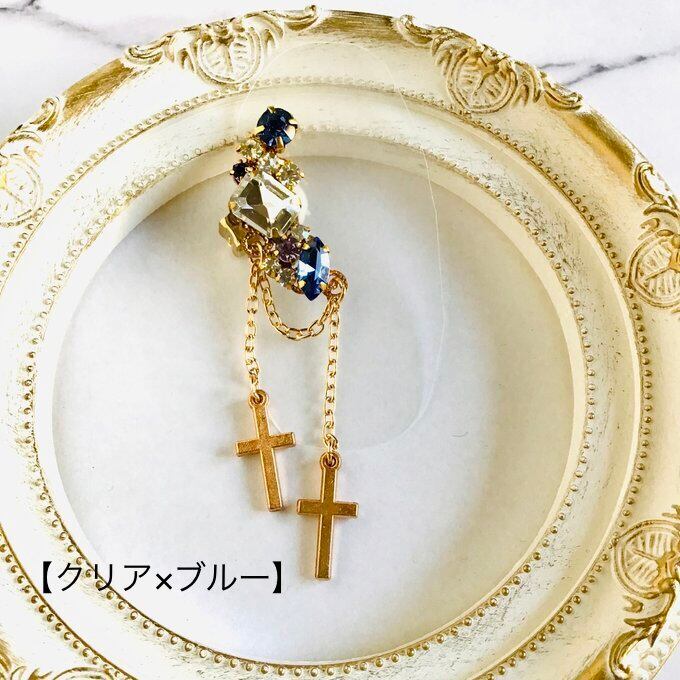ガラスのビジューと2連の十字架モチーフをチェーンで繋いだをゴシックテイストなイヤーカフです。今回メインの大きめビジューはスクエアタイプの物を使いました。