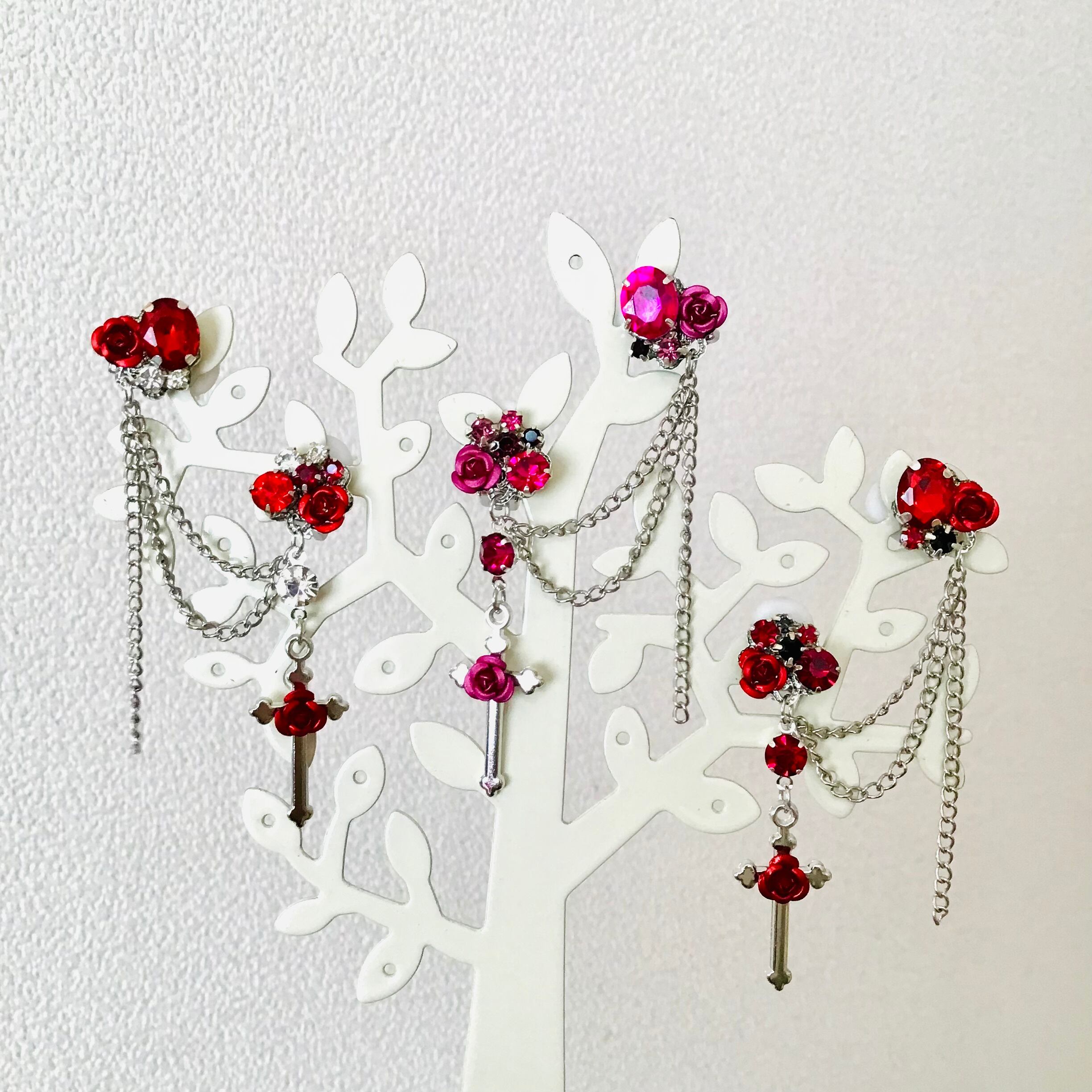 ガラスのビジュー×アルミ薔薇をつけた十字架をチェーンで繋いだをゴシックテイストなイヤーカフです